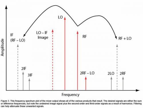 圖3:混頻器輸出的頻譜圖顯示產(chǎn)生的所有不同產(chǎn)物。需要的信號為和頻或差頻,不過請注意,有害鏡像信號和二階和三階信號為諧波的結果。濾波有助于減少這些有害信號。