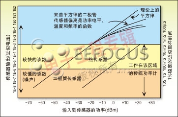 圖2所示為熱電堆單元和二極管檢測器的響應(yīng)。傳統(tǒng)的二極管檢測器要么工作在平方律區(qū)域,因此動(dòng)態(tài)范圍被限制為50dB;要么采用線性校正技術(shù)來擴(kuò)展它們的動(dòng)態(tài)范圍。這種技術(shù)受到功率計(jì)速度的限制,并且不適合于系統(tǒng)傳輸?shù)姆?hào)率遠(yuǎn)遠(yuǎn)超過功率計(jì)采樣率的應(yīng)用。