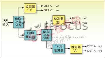 對(duì)于檢測器A的路徑,有40dB的衰減;如果輸入功率在+20dBm到-3.5dBm的范圍內(nèi),就要選擇該檢測器。因此,在二極管上的信號(hào)電平的變化范圍從-20dBm到-43.5dBm。檢測器B具有23dB的衰減,如果輸入功率的范圍在-3.5dBm到-23.5dBm之間,就要選擇該檢測器。在二極管上的信號(hào)電平的變化范圍從-26.5dBm到46.5dBm。