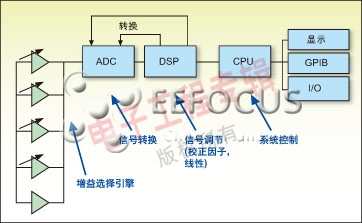 這是一個(gè)現(xiàn)代功率計(jì)的典型方框圖。輸入信號(hào)被放大后,經(jīng)過模數(shù)轉(zhuǎn)換,然后,由DSP處理。在傳統(tǒng)的功率計(jì)中,放大器的每一個(gè)量程的設(shè)置通常采用十倍量程。對(duì)寬動(dòng)態(tài)范圍功率傳感器的需求已經(jīng)導(dǎo)致要采用動(dòng)態(tài)范圍更大的模數(shù)轉(zhuǎn)換器,并且各量程的覆蓋范圍通常大于10dB。
