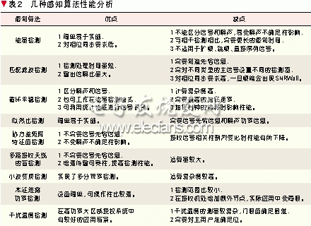以上這些算法都是對(duì)主用戶發(fā)射端信號(hào)的直接檢測(cè),基本都是從經(jīng)典的信號(hào)檢測(cè)理論中移植過(guò)來(lái)的。此外,近期一些文獻(xiàn)從主用戶接收端的角度提出了本振泄露功率檢測(cè)和基于干擾溫度的檢測(cè)。有些文獻(xiàn)對(duì)經(jīng)典算法進(jìn)行了改進(jìn),如文獻(xiàn)[2]提出了一種基于能量檢測(cè)-循環(huán)特征檢測(cè)結(jié)合的兩級(jí)感知算法。文獻(xiàn)[3]研究了基于頻偏補(bǔ)償?shù)钠ヅ錇V波器檢測(cè)、聯(lián)合前向和參數(shù)匹配的能量檢測(cè)、多分辨率頻譜檢測(cè)和基于小波變換頻譜檢測(cè)等。表2歸納了文獻(xiàn)中提及較多的一些感知算法,并對(duì)其優(yōu)缺點(diǎn)進(jìn)行了比較。