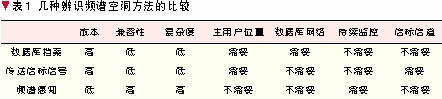 認(rèn)知無(wú)線電(CR)概念由Joseph Mitola博士提出,其主導(dǎo)思想是實(shí)現(xiàn)伺機(jī)的動(dòng)態(tài)頻譜接入,即非授權(quán)用戶(也稱次用戶或認(rèn)知用戶)通過(guò)檢測(cè),機(jī)會(huì)性地接入已分配給授權(quán)用戶(或主用戶) 但暫時(shí)很少使用甚至未被使用的空閑頻段,一旦主用戶重新接入該頻段,次用戶迅速騰出信道。這種技術(shù)需解決的首要問(wèn)題就是如何快速準(zhǔn)確地獲取授權(quán)頻譜的使用情況,目前主要有3類解決方案:建立數(shù)據(jù)庫(kù)檔案、傳送信標(biāo)信號(hào)和頻譜感知。表1從多個(gè)方面對(duì)3種方案進(jìn)行了比較,其中頻譜感知方案因具有建設(shè)成本低、與現(xiàn)有主系統(tǒng)的兼容性強(qiáng)等突出優(yōu)點(diǎn),得到了大多數(shù)研究學(xué)者的認(rèn)同;另外兩種由于受到政治、經(jīng)濟(jì)等因素的制約而很難實(shí)現(xiàn),對(duì)其研究相對(duì)較少。