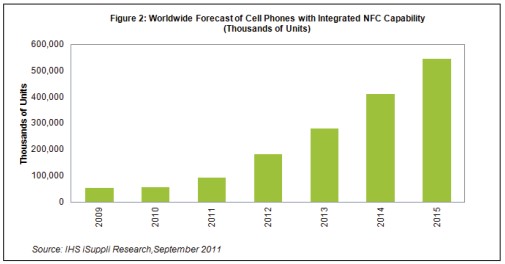 據(jù)IHS iSuppli公司的移動與無線通信研究報告,由于市場對移動電子支付和其它應(yīng)用的需求旺盛,2015年采用近距離通信(NFC)技術(shù)的手機出貨量將是是2010年5620萬部的10倍,達(dá)到5.447億部。