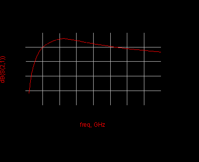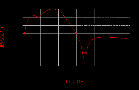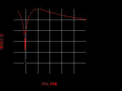 由于高頻段(DCS)的增益在第二和第三級(jí)時(shí)略低,因此設(shè)計(jì)第一級(jí)放大電路時(shí),DCS頻段第一級(jí)增益比GSM頻段第一級(jí)高約3dB。同時(shí),在DCS 頻段射頻輸入端加入濾波網(wǎng)絡(luò),如圖2所示。此濾波網(wǎng)絡(luò)對(duì)GSM頻段信號(hào)起到帶阻作用,同時(shí)對(duì)DCS頻段信號(hào)起到帶通作用,加入此濾波網(wǎng)絡(luò)可有效地提高交叉隔離度。該濾波網(wǎng)絡(luò)的仿真原理圖與仿真結(jié)果分別如圖4、圖5所示。本設(shè)計(jì)電路GSM頻段和DCS頻段總增益仿真結(jié)果如圖6、圖7所示。