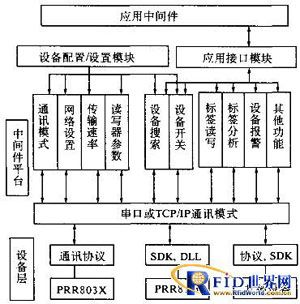 RFID技術(shù)的基本工作原理是:標(biāo)簽進(jìn)入磁場(chǎng)后,接收讀寫器發(fā)出的射頻信號(hào),憑借感應(yīng)電流所獲得的能量發(fā)送出存儲(chǔ)在芯片中的產(chǎn)品信息(Passive Tag,無(wú)源標(biāo)簽或被動(dòng)標(biāo)簽),或者主動(dòng)發(fā)送某一頻率的信號(hào)(Active Tag,有源標(biāo)簽或主動(dòng)標(biāo)簽):讀寫器讀取信息并解碼后,送至中央信息系統(tǒng)進(jìn)行有關(guān)數(shù)據(jù)處理。中間件是介于應(yīng)用系統(tǒng)和系統(tǒng)軟件之間的一類軟件,它使用系統(tǒng)軟件所提供的基礎(chǔ)服務(wù),銜接網(wǎng)絡(luò)上應(yīng)用系統(tǒng)的各個(gè)部分或不同的應(yīng)用,以達(dá)到資源共享、功能共享的目的.在具體實(shí)現(xiàn)上,中間件是一個(gè)用API定義的軟件層,具有強(qiáng)大的通信能力和良好的可擴(kuò)展性。