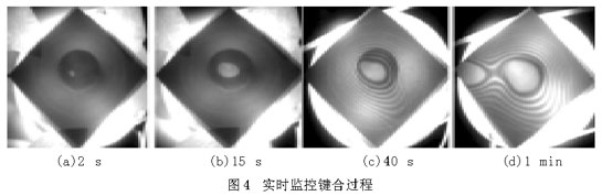 將紅外檢測應(yīng)用到鍵合裝置中,可以實(shí)時(shí)監(jiān)控鍵合過程。圖4(a)~(d)是截取的預(yù)鍵合過程中的4幅圖片,可以清晰地觀察鍵合波從中間向四周擴(kuò)張的傳播過程。圖中所標(biāo)的數(shù)字表示預(yù)鍵合時(shí)間(晶片經(jīng)活化處理后,從兩晶片開始接觸到逐步鍵合所經(jīng)歷的時(shí)間)。1 min后,鍵合面積基本不再發(fā)生變化,預(yù)鍵合結(jié)果如圖4(d)所示。