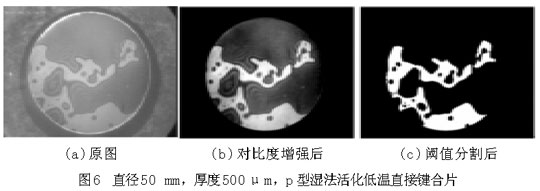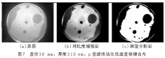 圖6(a)和圖7(a)中,圓形區(qū)域是要鍵合的圓片,其中明區(qū)為鍵合上的地方,暗區(qū)為未鍵合上的地方,圓形區(qū)域(即鍵合圓片)以外為圖像背景。從圖上可以大致地看出空洞(未鍵合區(qū)域)的分布、個(gè)數(shù)和大小等。為了獲得更為準(zhǔn)確的數(shù)據(jù)信息,借助圖像處理程序?qū)D片(a)進(jìn)行對比度增強(qiáng)、平滑、分割等一系列處理,可獲得圖(b),(c),從而得到鍵合率。樣品1的鍵合率為28.12%,鍵合率很低,并且從圖6中空洞的分布可以看出,樣品1鍵合得很不好。樣品2的鍵合率為66.12%。比較圖6和圖7,樣品2的鍵合質(zhì)量明顯優(yōu)于樣品1,可以說明鍵合圓片越薄,越容易鍵合??梢詮钠桨謇碚摾斫膺@一鍵合現(xiàn)象,圓片越薄,界面表面能克服圓片翹曲貼合到一起所需要的力越小。