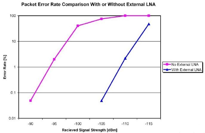 圖2:有/無外部LNA的低功耗無線接收機(jī)的誤包率對(duì)比。本例中實(shí)現(xiàn)了15dB的增益改善。