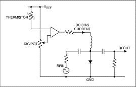 有些系統(tǒng)可能需要進行溫度補償(圖3),簡化電路中,數(shù)字電位器IC建立固定或可調(diào)偏置電平,熱敏電阻提供溫度輸入。這兩個輸入連接到運算放大器,產(chǎn)生的輸出通過一個電阻驅(qū)動PIN二極管。
