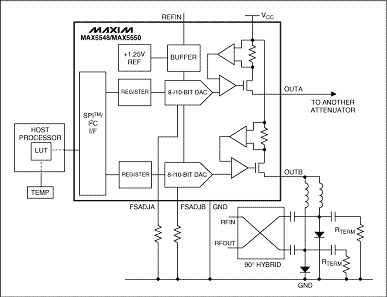 圖4. RF衰減器受電流輸出DAC (MAX5548或MAX5550)驅(qū)動,