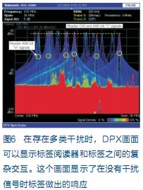 在進(jìn)行頻率規(guī)劃,把每個(gè)閱讀器限定在某條通道(或多條通道)時(shí),可以使用DPX保證調(diào)制邊帶的電平不會(huì)在并放閱讀器使用的通道中產(chǎn)生干擾。注意圖6中心的閱讀器和標(biāo)簽信號(hào)擁有寬頻譜展寬,駐留時(shí)間要長于其它通道。較亮的信號(hào)邊緣表明信號(hào)密度較高,因此駐留時(shí)間較長。這可能會(huì)導(dǎo)致鄰道讀取失敗,應(yīng)采取措施,保證閱讀器中的濾波功能足以抗擊這種干擾。