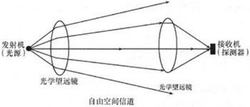 一個光無線通信系統(tǒng)構(gòu)成如圖1所示,包括三個部分:發(fā)射機、信道和接收機。光發(fā)射機的光源受到電信號的調(diào)制,并通過作為天線的光學(xué)望遠(yuǎn)鏡,將光信號經(jīng)過空間送到接收端的望遠(yuǎn)鏡。高靈敏度的光接收機,將望遠(yuǎn)鏡收到的光信號再轉(zhuǎn)換成電信號,值得注意的是,發(fā)送端和接收端之間,必須是互相視線可見的,兩終端之間不能有阻擋。由于大氣空間對不同光波長信號的透過率有較大的差別,可以選用透過率較好的波段窗口。光無線系統(tǒng)通常使用0.85μm或1.5μm紅外波段。0.85μm的設(shè)備相對便宜,一般應(yīng)用在傳輸距離不太遠(yuǎn)的場合。1.5μm的設(shè)備價格要高一些,但在功率、傳輸距離和視覺安全方面有更好的表現(xiàn)。 1.5μm的紅外光波大部分都被角膜吸收,照射不到視網(wǎng)膜,因此,相關(guān)安全規(guī)定允許1.5μm波長設(shè)備的功率可以比0.85μm的設(shè)備高2個等級,1.5μm波長的光無線通信具有更廣闊的使用前景。