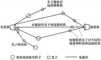 對天氣非常敏感是FSO的另一個主要問題。晴天對FSO傳輸質(zhì)量的影響最小,而雨、雪和霧的影響較大。據(jù)測試,F(xiàn)SO 受天氣影響的衰減經(jīng)驗值分別為:晴天,5~15dB/km;雨天,20~50dB/km;雪天,50-150dB/km;霧天,50~300dB/km??梢娪绊懽畲蟮氖庆F天,這是因為霧中的散射粒子的半徑與激光的波長在同一數(shù)量級上,而且散射粒子非常集中,從而使光線的傳播方向發(fā)生偏轉(zhuǎn),造成空間、角度和時間上的擴展,如圖2。對于這種大氣現(xiàn)象處理的方式,與微波通信中對待雨衰相似。要在系統(tǒng)傳輸?shù)挠嬎阒?,為光信號的衰減留有足夠的系統(tǒng)功率余量,以便在出現(xiàn)濃霧最大衰減的情況下,仍能接收到所需的光信號功率。重要的是,要獲得所在地長期的氣象統(tǒng)計資料,能夠知道不同等級(能見度)的霧,即不同衰減的大氣介質(zhì)出現(xiàn)的統(tǒng)計規(guī)律。如果了解到衰減值大于某一指標(biāo)出現(xiàn)的概率,就能確定光無線系統(tǒng)為了保證可用性的指標(biāo)(比如99.9%),需要容納多大的大氣損耗。而傳輸距離的計算公式如式(1)所示。