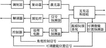隨著通信技術(shù)的發(fā)展,對FSO系統(tǒng)的傳輸速率和距離均提出了更高的要求,如果要提高這兩個技術(shù)指標(biāo),就必須要增大激光器的發(fā)射功率和提高接收機的靈敏度,但擴束法和多束法對性能指標(biāo)的改善有限,于是動態(tài)跟蹤法就應(yīng)運而生,即利用伺服系統(tǒng)通過反饋裝置獲得光束偏差信息,調(diào)整可調(diào)微鏡,使光束時刻對準(zhǔn)接收器。采用動態(tài)跟蹤技術(shù)的FSO系統(tǒng)設(shè)備功能結(jié)構(gòu)如圖3所示,一般采用雙反饋方式,外反饋是位置探測器輸出的入射激光束的位置誤差信號,內(nèi)反饋是伺服系統(tǒng)控制的可調(diào)微鏡的位置信號,入射激光束通過接收光學(xué)系統(tǒng)后,聚集到位置探測器上,位置探測器將激光束的位置誤差信號輸出到主處理器。同時可調(diào)微鏡位置探測器將探測到的微鏡位置信號送到控制處理器中,控制處理器利用優(yōu)化的跟蹤算法進(jìn)行計算,輸出的角度控制信號控制伺服系統(tǒng)調(diào)整可調(diào)微鏡,使接收光學(xué)系統(tǒng)始終對準(zhǔn)入射激光束。
