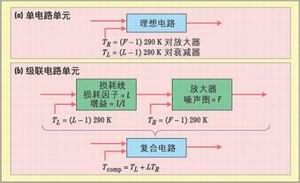 上列方程中,TR和TL分別為放大器(接收電路)和衰減器(損耗線)的有效溫度,F(xiàn)和L分別代表噪聲譜和損耗因子。圖2b是應用于一對級聯(lián)電路元件(一條損耗線加上一個放大器)的模型,其中損耗線的增益可表示為1/L。
