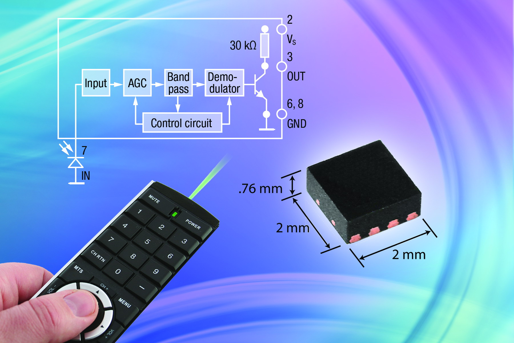 Vishay的標準遙控接收器是將光敏二極管和信號調制IC裝配在同一封裝內。VSOP383..和VSOP584..是把信號調制IC與光敏二極管分開,單獨封裝于QFN封裝里,為各種應用提供了極大的靈活性。例如,可以采用多個光敏二極管對準不同方向來實現(xiàn)超寬空間接收信號的系統(tǒng),光敏管還可以采用可滿足特殊要求的封裝,或是接收非傳統(tǒng)波長,例如藍光,用于水下作業(yè)或可見光通信。
