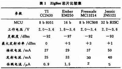 ZigBee技術(shù)是一種近距離、低功耗、低數(shù)據(jù)速率、低復(fù)雜度的雙向無(wú)線(xiàn)通信技術(shù),適用于無(wú)線(xiàn)傳感器網(wǎng)絡(luò)。目前,多家公司均有自己的主流ZigBee芯片,如表1所示。經(jīng)綜合比較,該設(shè)計(jì)選用CC2430芯片,該芯片是Chipcon公司提供的全球首款支持ZigBee協(xié)議的SoC解決方案,它在單個(gè)芯片上整合了ZigBee射頻前端、內(nèi)存和微控制器,最大27 mA的工作流耗及在休眠模式下0.9μA的流耗使之非常適合無(wú)線(xiàn)傳感節(jié)點(diǎn)對(duì)低功耗的要求。