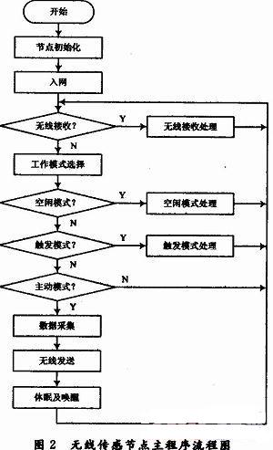 節(jié)點(diǎn)程序主流程如圖2所示,主要包括數(shù)據(jù)采集和無(wú)線(xiàn)通信兩個(gè)部分。出于傳感節(jié)點(diǎn)低功耗的考慮,軟件設(shè)計(jì)重點(diǎn)放在工作模式的處理上。