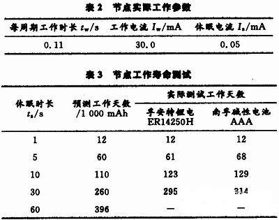 通過(guò)測(cè)試獲取節(jié)點(diǎn)工作參數(shù)如表2所示,工作電壓為3.3 V??芍?,節(jié)點(diǎn)工作時(shí)流耗大,在休眠狀態(tài)則小得多。因此,為保證在供電電量有限的情況下獲得更長(zhǎng)的工作壽命,有必要將節(jié)點(diǎn)設(shè)置為間歇式工作模式,即工作休眠周期性交替進(jìn)行。下式為節(jié)點(diǎn)壽命預(yù)測(cè)公式: