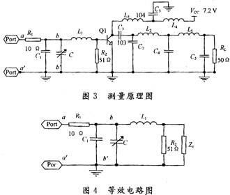 下面僅說明測量射頻功率管2SC1971的輸入阻抗的具體過程,輸出阻抗的測量方法與此相似。圖3是測量2SC1971的輸入阻抗的原理圖,圖4是他的等效電路圖。R1的值設計為10 Ω左右,以減少輸入的功率,同時HA由R1組成比較簡單,便于計算,HB由L1,C1,R2組成,同時也是功率管的匹配和偏置網(wǎng)絡。HA,HB也可以由多級L型或Ⅱ型雙口網(wǎng)絡組成,只是計算量增大。經(jīng)過實測采用單級L型網(wǎng)絡在bb′處測得的波形比較接近正弦波,測量出的結果誤差不大。