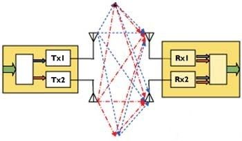 通過使用多路傳輸方式,在每個接收天線上采用空間微分技術(shù),使得DSP能夠進(jìn)行信號分離并恢復(fù)原始的兩路數(shù)據(jù)流。使用相同射頻信道的獨立發(fā)射器,在它們各自的天線上發(fā)送出獨立的數(shù)據(jù),然后,接收天線匯集所有發(fā)射器的復(fù)合信號。通過巧妙設(shè)計的MIMO報文和先進(jìn)的DSP,就可以恢復(fù)出獨立的數(shù)據(jù)流。數(shù)據(jù)速率與發(fā)射器和天線數(shù)量之間具有幾乎線性的關(guān)系,速率的提高并不需要增大信道帶寬。