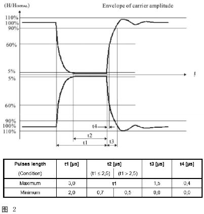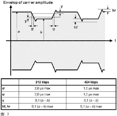 由于NFC106kbps為100%ASK調(diào)變,所以對整個(gè)High/Low信號(hào)的封包結(jié)構(gòu)都有相當(dāng)詳細(xì)的定義。其中幾個(gè)參數(shù)包括從100%下降到5%Am時(shí)間(t1)、5%Am持續(xù)時(shí)間(t2)、Am由5%上升至60%時(shí)間(t4)即overshoot的范圍。而212/424kbps則是8%~30%的調(diào)變率。