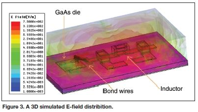 第二個(gè)關(guān)注的地方是微帶線附近的場線,在靠近地平面的地方它們最強(qiáng)。只要屏蔽和地平面間的距離明顯大于微帶線和地平面間的距離,則增加的屏蔽的效用就微乎其微。線綁定和表貼電感與地平面的直接耦合要弱些,當(dāng)施加屏蔽時(shí),預(yù)期其場線會(huì)有變化。圖3顯示的是3D模擬的E場分布。