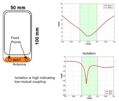 還有一種可行的解決方案,使用SkyCross公司提供的隔離模式天線技術(shù)(iMAT),從相同的天線結(jié)構(gòu)產(chǎn)生兩種不同的模式。iMAT天線結(jié)構(gòu)放置在手機的一端;兩個饋點分別運行不同的輻射模式。這兩個饋點是相互隔離的,不會發(fā)生互耦導致的損耗,因此每種模式的效率都很高。另外,輻射圖案是不同的,因此會產(chǎn)生一個較低的相關(guān)系數(shù)。圖4描述了iMAT天線的實現(xiàn)原理,從圖中可以看到,在相同天線結(jié)構(gòu)上的兩個饋點之間的隔離。