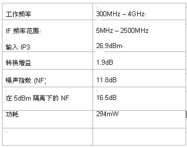 - 具卓越的 26.9dBm IIP3、294mW 的低功耗和 2.5GHz 的寬 IF 帶寬