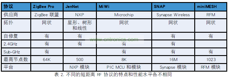使用芯片制造商開(kāi)發(fā)的專有協(xié)議可免去 ZigBee 許可證費(fèi)(見(jiàn)表 2)。 NXP 提供 JenNet 協(xié)議,該協(xié)議在 2.4GHz 波段內(nèi)運(yùn)行,能組建樹(shù)狀、星狀和線性自修復(fù)網(wǎng)絡(luò),最高包含500 個(gè)節(jié)點(diǎn)。 Microchip 的免費(fèi) MiWi 堆棧同時(shí)以 sub-GHz和 2.4GHz 兩種頻率,在 PIC 微控制器和 Microchip 收發(fā)器上運(yùn)行。