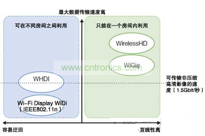 Wi-Fi Display、WiDi和WHDI因電波比較容易迂回,適用于在不同房間的連接,采用60GHz頻帶毫米波的WirelessHD和WiGig雖然可以確保傳輸速度,但如果有障礙物的話,電波難以到達,因此主要在一個房間內(nèi)使用。