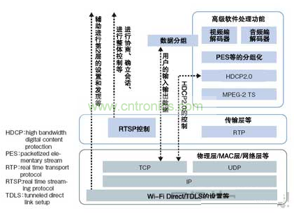 Wi-Fi Display是以無需經(jīng)由WLAN接入點即可在終端間直接通信的標(biāo)準(zhǔn)“Wi-Fi Direct”為基礎(chǔ),由上層的協(xié)議棧軟件構(gòu)成的安裝指南。鎖定終端服務(wù)的“服務(wù)發(fā)現(xiàn)(Service Discovery)”等的處理利用Wi-Fi Direct進行,影像的壓縮/解壓處理及管理數(shù)據(jù)流的傳輸層等利用Wi-Fi Display處理(圖2)。壓縮/解壓采用H.264格式。由于最近的智能手機不但標(biāo)配WLAN功能,采用內(nèi)置H.264編解碼器電路GPU的終端也很多,因此Wi-Fi Display還具有易于配備到終端中的特點。“在受限于安裝面積和耗電量的智能手機中,無需追加硬件即可配備的優(yōu)勢非常大”(Cavium公司的柴田)。
