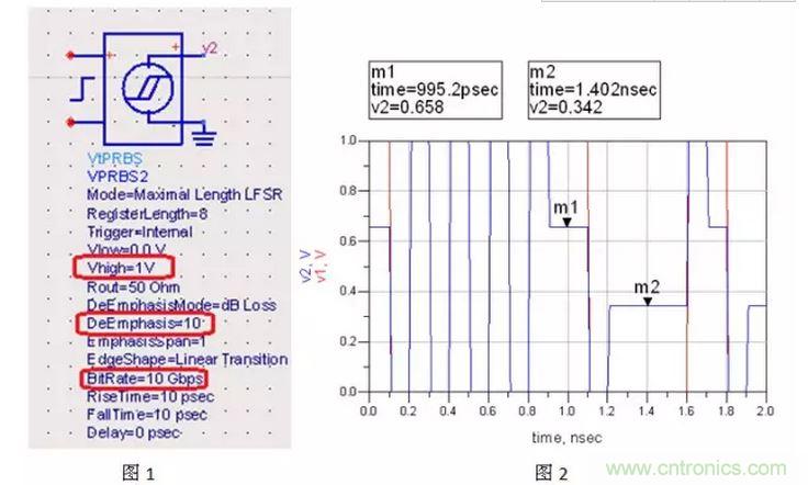 圖2中藍(lán)色信號是驅(qū)動端速率為10Gbps(基頻為5GHz),輸出幅值為1V,去加重為10db時的輸出波形,紅色為去加重為0時的輸出波形。