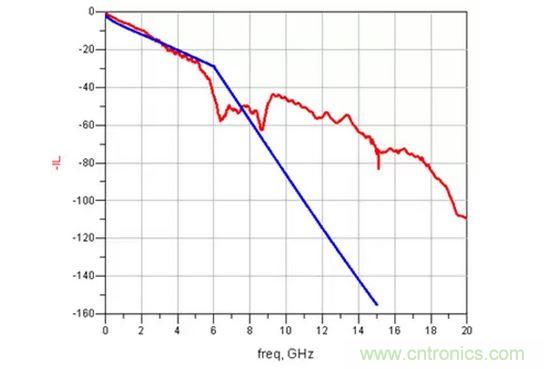 去加重的頻響曲線如下圖紅色曲線,淺藍(lán)色為一根5GHz時衰減為10db傳輸線: