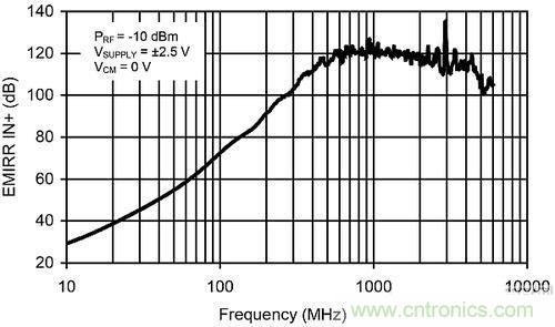 考慮到所有這些因素,電路板和系統(tǒng)級設(shè)計人員應(yīng)如何選擇放大器呢?答案是:要看電磁干擾抑制比(EMIRR)。該技術(shù)指標(biāo)類似于電源抑制比和共模抑制比,因為它在放大器的輸入端將RF干擾的影響轉(zhuǎn)換成DC偏移電壓。作為一個例子,圖1展示了OPA333的EMIRR曲線。從曲線可注意到,當(dāng)頻率為1000MHz時該運放具有120dB的EMIRR。這是非常高的抑制水平,使得直接把該曲線與其它器件的曲線進(jìn)行比較成為可能。