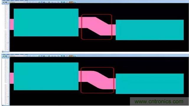 圖2:有效的PCB 設(shè)計工具會自動考慮用于繪制形狀的線型,以計算準確的線條寬度,幫助您輕松創(chuàng)建尖拐角。