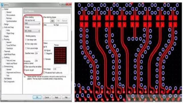 射頻設(shè)計的另一個重要方面是確保正確地屏蔽帶過孔的區(qū)域。盡管此任務可由設(shè)計人員手動進行,但這個過程極其耗時。如果PCB 設(shè)計工具能夠自動完成此過程,將可以縮短設(shè)計周期時間并確保符合您的所有設(shè)計規(guī)則。利用此類工具,設(shè)計人員可以指定過孔模式生成規(guī)則,而將剩余的工作全部交由PCB 設(shè)計工具完成。