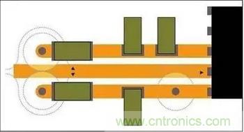 每個(gè)這些通孔都會(huì)在內(nèi)接地層上產(chǎn)生大于通孔直徑自身的禁入?yún)^(qū),提供制造空隙。這些禁入?yún)^(qū)很容易在回流路徑上造成中斷。一些通孔彼此靠近則會(huì)形成接地層溝,頂層CAD視圖看不見(jiàn),這將導(dǎo)致情況進(jìn)一步復(fù)雜化。圖2兩個(gè)電源層通孔的接地層空隙可產(chǎn)生重疊的禁入?yún)^(qū),并在返回路徑上造成中斷?;亓髦荒苻D(zhuǎn)道繞過(guò)接地層禁入?yún)^(qū),形成現(xiàn)在常見(jiàn)的發(fā)射感應(yīng)路徑問(wèn)題。