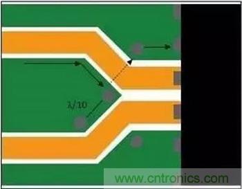 時(shí)鐘分布或合成器設(shè)備路由出來(lái)、用于承載相同頻率的跡線集群可能相鄰而行,因?yàn)楦蓴_源音調(diào)已經(jīng)存在于接收器線路上。不過(guò),分組的線路最終會(huì)分散。分散時(shí),應(yīng)在分散線路之間提供接地灌流,并在其開(kāi)始分散的地方灌入通孔,以便感應(yīng)回流沿著額定回流路徑流回。在圖3中,接地島末端的通孔可使感應(yīng)電流流到參考層上。接地灌流上其它通孔之間的間隔不要超過(guò)一個(gè)波長(zhǎng)的十分之一,以確保接地不會(huì)成為共振結(jié)構(gòu)。