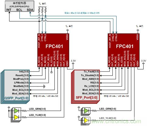 FPC401將多達(dá)56個(gè)端口的所有低速信號(hào)集成到單個(gè)快速I2C總線(高達(dá)1MHz)或串行外設(shè)接口(SPI)總線(高達(dá)10 MHz)中,大大降低了線路復(fù)雜性并簡化了設(shè)計(jì)可擴(kuò)展性。FPC401四個(gè)端口中的每一個(gè)端口都具有三個(gè)輸入、四個(gè)輸出和一個(gè)I2C主機(jī),從而實(shí)現(xiàn)對(duì)下游模塊的完全控制。有關(guān)SFP和QSFP連接的示例,請(qǐng)參見圖2。