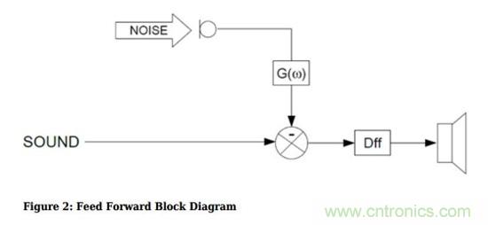 如果把系統(tǒng)畫成信號流圖,就是下圖,噪聲在麥克風采樣后進入信號處理電路,產(chǎn)生“反”噪聲,并與音樂一起送進耳機內。這種模式稱為前饋有源噪聲消除。
