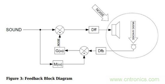 在反饋有源噪聲消除方案中,麥克風采樣的不是直接的環(huán)境噪聲,而是耳機輸出處的聲音,顯然這里的聲音包括了音樂和環(huán)境噪聲。那么如何選擇性地抵消掉噪聲但是保留音樂呢?就需要把這里采樣到的聲音減去音樂,這樣剩下的信號就全是噪聲了;然后再根據(jù)這個噪聲去產(chǎn)生噪聲抵消信號。這樣做的話,就不會有風噪問題。然而,這里又有一個新問題,就是反饋系統(tǒng)通常帶寬會遠小于前饋系統(tǒng),因此使用反饋模式的有源噪聲消除對于高頻噪聲的抵消作用有限。