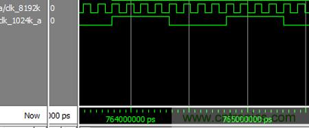 根據(jù)所需的時(shí)鐘頻率為1024kHz的時(shí)鐘,而晶振時(shí)鐘的頻率為8192kHz,晶振時(shí)鐘與所需的時(shí)鐘頻率恰巧是8倍的整數(shù)倍關(guān)系,因此需要對(duì)8192kHz的晶振時(shí)鐘進(jìn)行8分頻來(lái)獲得所需要的時(shí)鐘。根據(jù)整數(shù)倍分頻器的設(shè)計(jì)方法原理,通過(guò)ISE9.1邏輯設(shè)計(jì)工具,利用VHDL硬件描述語(yǔ)言來(lái)進(jìn)行8分頻的分頻器設(shè)計(jì)。然而8又是偶數(shù),所以需要設(shè)計(jì)的是偶數(shù)分頻器。對(duì)設(shè)計(jì)的內(nèi)容通過(guò)Modelsim6.5仿真軟件進(jìn)行仿真驗(yàn)證,結(jié)果如圖3-1所示。