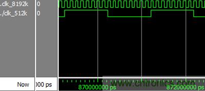 根據(jù)所需的時(shí)鐘頻率為512kHz的時(shí)鐘,而晶振時(shí)鐘的頻率為8192kHz,晶振時(shí)鐘與所需的時(shí)鐘頻率恰巧是16倍的整數(shù)倍關(guān)系,因此需要對(duì)8192kHz的晶振時(shí)鐘進(jìn)行16分頻來(lái)獲得所需要的時(shí)鐘。根據(jù)整數(shù)倍分頻器的設(shè)計(jì)方法原理,通過(guò)ISE9.1邏輯設(shè)計(jì)工具,利用VHDL硬件描述語(yǔ)言來(lái)進(jìn)行16分頻的分頻器設(shè)計(jì)。然而16又是偶數(shù),所以需要設(shè)計(jì)的是偶數(shù)分頻器。對(duì)設(shè)計(jì)的內(nèi)容通過(guò)Modelsim6.5仿真軟件進(jìn)行仿真驗(yàn)證,結(jié)果如圖3-2所示。