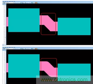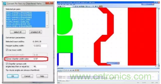 射頻和微波電路中經(jīng)常用到倒角,以減小供給線與電容之間的分段不連續(xù)性阻抗,從而改善 MMIC 的頻率性能。90º拐角與倒角之間的距離至關(guān)重要。因此,設(shè)計(jì)人員需要采用自動方法來基于設(shè)計(jì)指定需要產(chǎn)生的倒角比率。PCB設(shè)計(jì)工具如果能夠基于設(shè)計(jì)規(guī)則自動強(qiáng)制實(shí)施需要產(chǎn)生的倒角比率,設(shè)計(jì)人員和工程師將會從中受益,在節(jié)省時(shí)間的同時(shí)提高設(shè)計(jì)質(zhì)量(圖 3)。