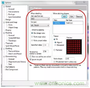 射頻設(shè)計(jì)的另一個(gè)重要方面是確保正確地利用vias屏蔽特定的區(qū)域。盡管此任務(wù)可由設(shè)計(jì)人員手動進(jìn)行,但這個(gè)過程極其耗時(shí)。如果PCB設(shè)計(jì)工具能夠自動完成此過程,將可以縮短設(shè)計(jì)周期時(shí)間并確保符合您的所有設(shè)計(jì)規(guī)則。利用此類工具,設(shè)計(jì)人員可以指定via模式產(chǎn)生特定規(guī)則,而將剩余的工作全部交由PCB設(shè)計(jì)工具完成。