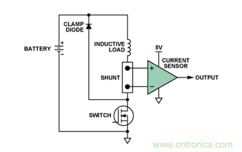 本例將詳細(xì)介紹一種典型的高端電流檢測(cè)應(yīng)用。圖1所示為汽車應(yīng)用環(huán)境中用于監(jiān)控電磁閥或其它感性負(fù)載的常見(jiàn)配置。