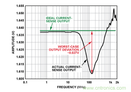 這種情況下,40 MHz時(shí)誤差僅為3 mV左右,且峰值誤差(大于100 MHz時(shí))小于30 mV,性能提高35倍。這點(diǎn)清楚地表明,內(nèi)置EMI濾波電路有助于顯著提高電流傳感器防護(hù)性能,使其免受輸入端存在的高頻信號(hào)影響。在實(shí)際應(yīng)用中,盡管并不清楚EMI的嚴(yán)重程度,但是如果使用內(nèi)置EMI濾波功能的電流傳感器,實(shí)際上控制環(huán)路將會(huì)保持在其容差范圍內(nèi)。
