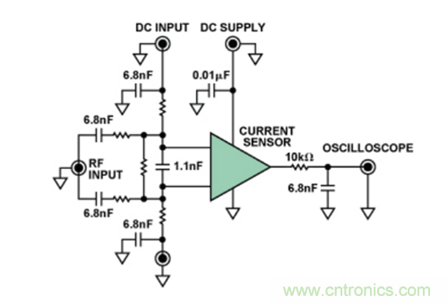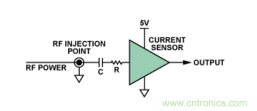 具體而言,這些測(cè)試都采用 “直接功率注入法”完成,這是一種通過(guò)電容將RF信號(hào)耦合至特定器件引腳的方法。根據(jù)待測(cè)IC的類型,針對(duì)不同的RF信號(hào)功率水平和頻率范圍,測(cè)試器件的每路輸入。圖4顯示了在特定引腳上執(zhí)行直接功率注入測(cè)試的原理示意圖。