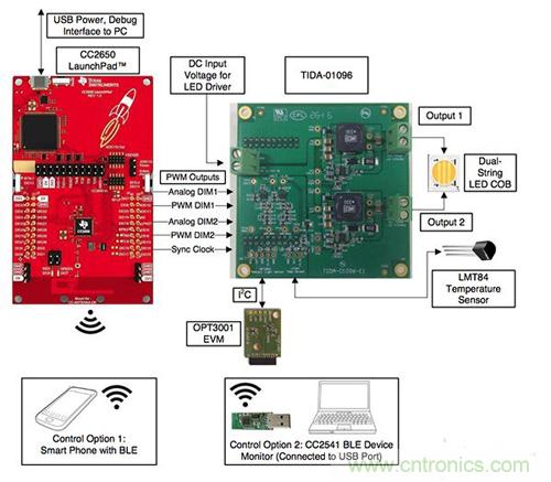 圖 5 顯示了如何使用與 SimpleLink CC2650 LaunchPad 配對(duì)的 TIDA-01096 來(lái)配置基于參考設(shè)計(jì)的 LED 照明解決方案的硬件。該項(xiàng)目的固件是由 TI 作為代碼調(diào)試器項(xiàng)目開發(fā)的,可根據(jù)要求提供。